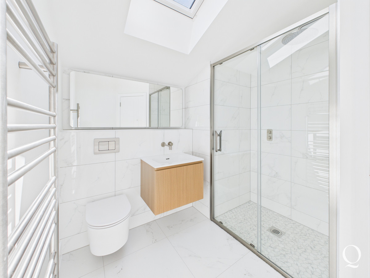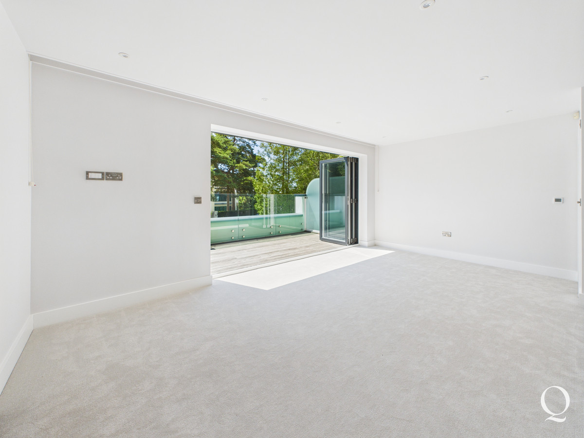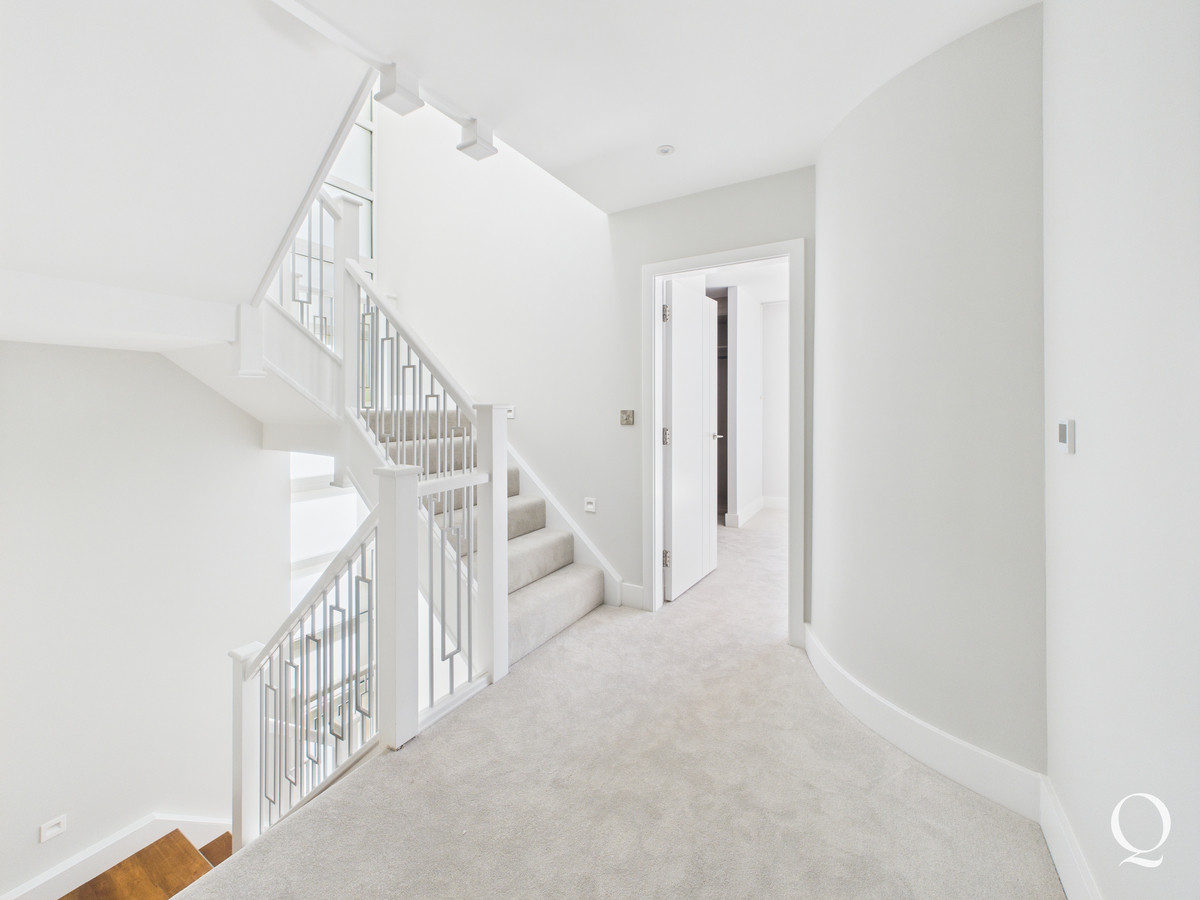 On the first floor the landing gives access to three bedrooms. The principle bedroom is a large double room with bi-fold doors out to a southerly balcony. A walk in wardrobe is fitted with a range of hanging and shelving space, with concealed LED lighting. The en-suite has been beautifully re-fitted with fully tiled floor and walls, twin basins, bath, WC and separate shower enclosure. Bedroom two boasts its own en-suite shower room whilst the third double bedroom is served by a separate bathroom.