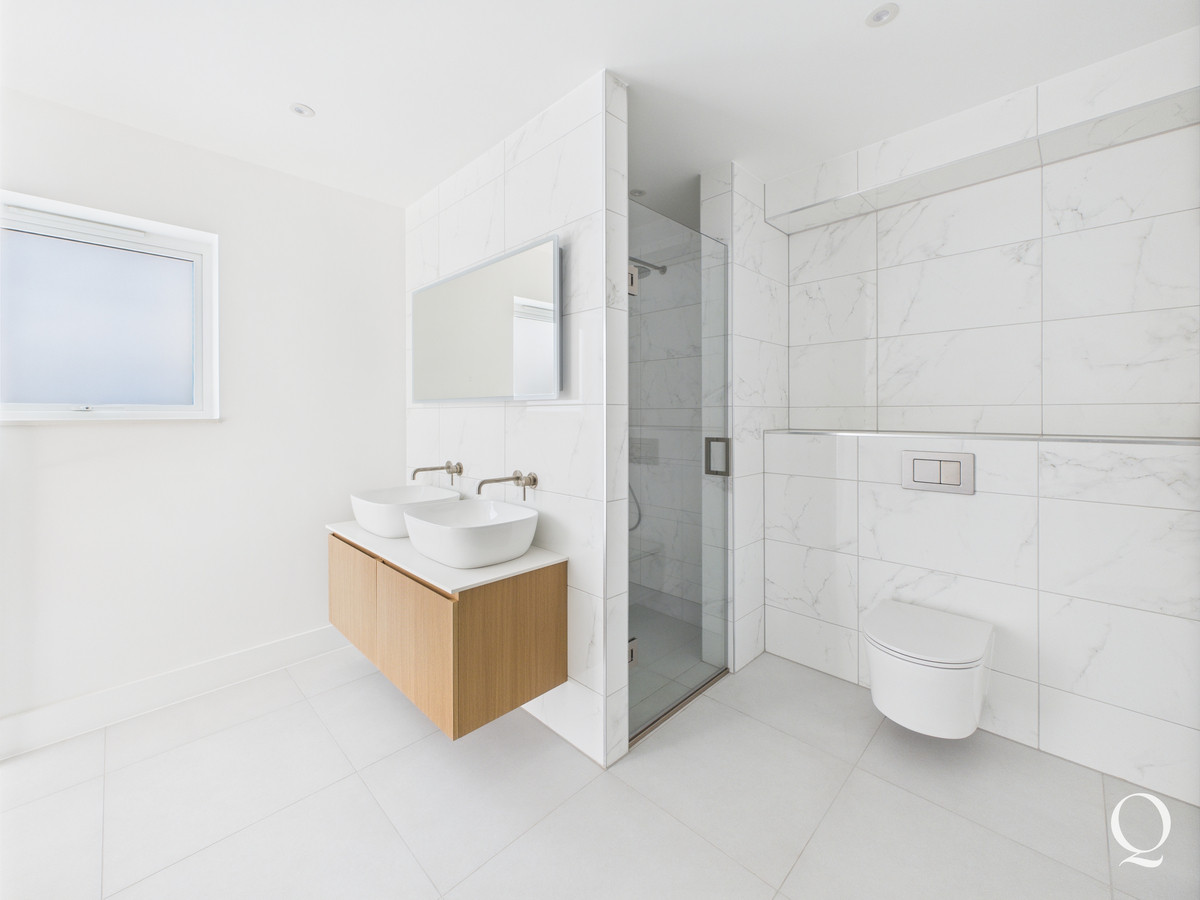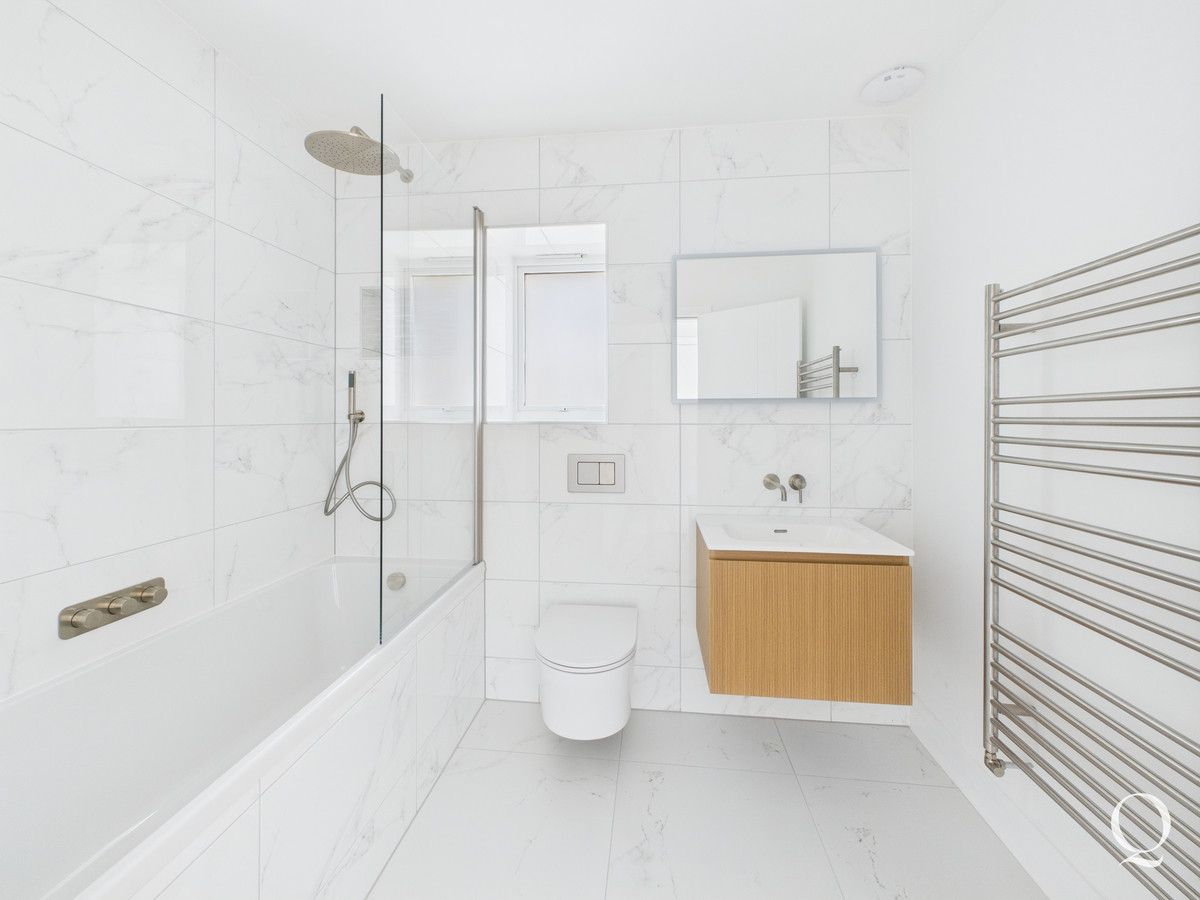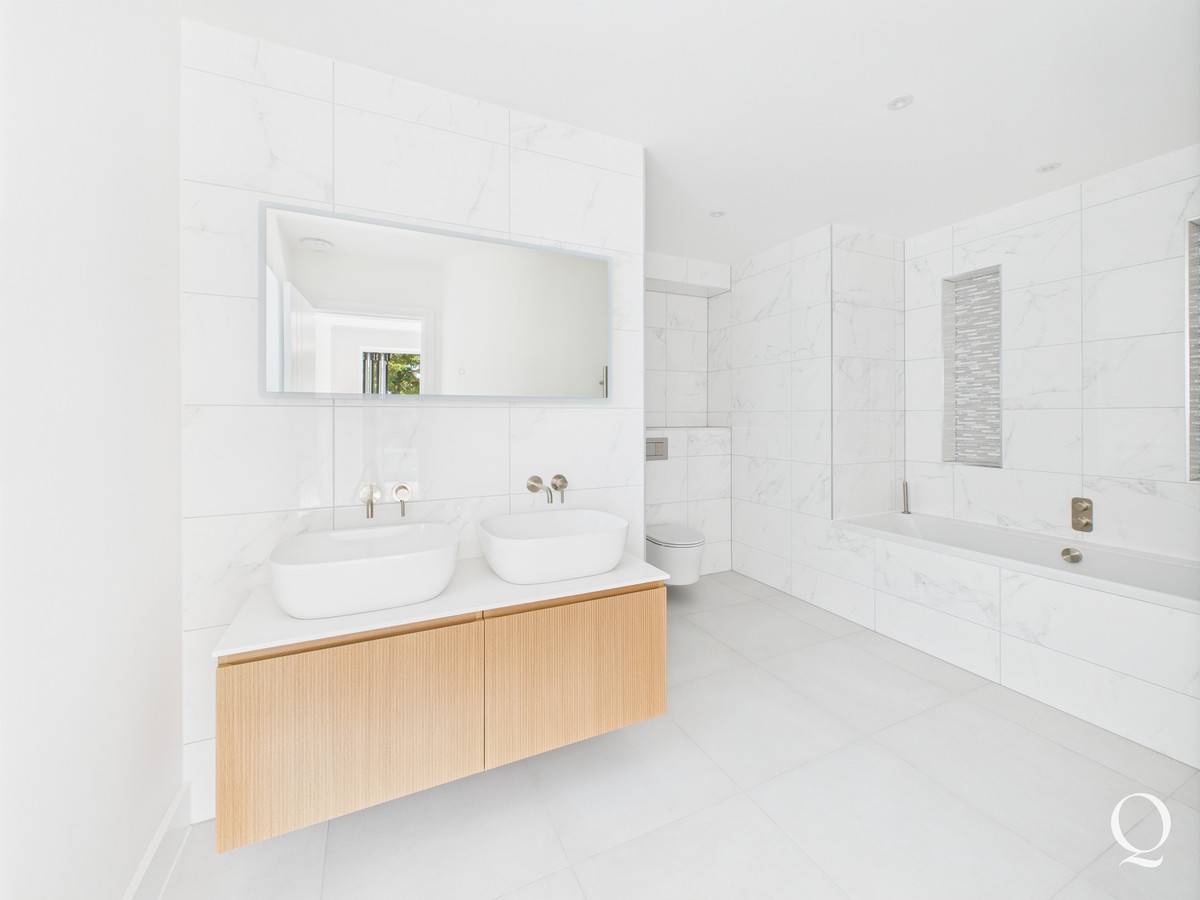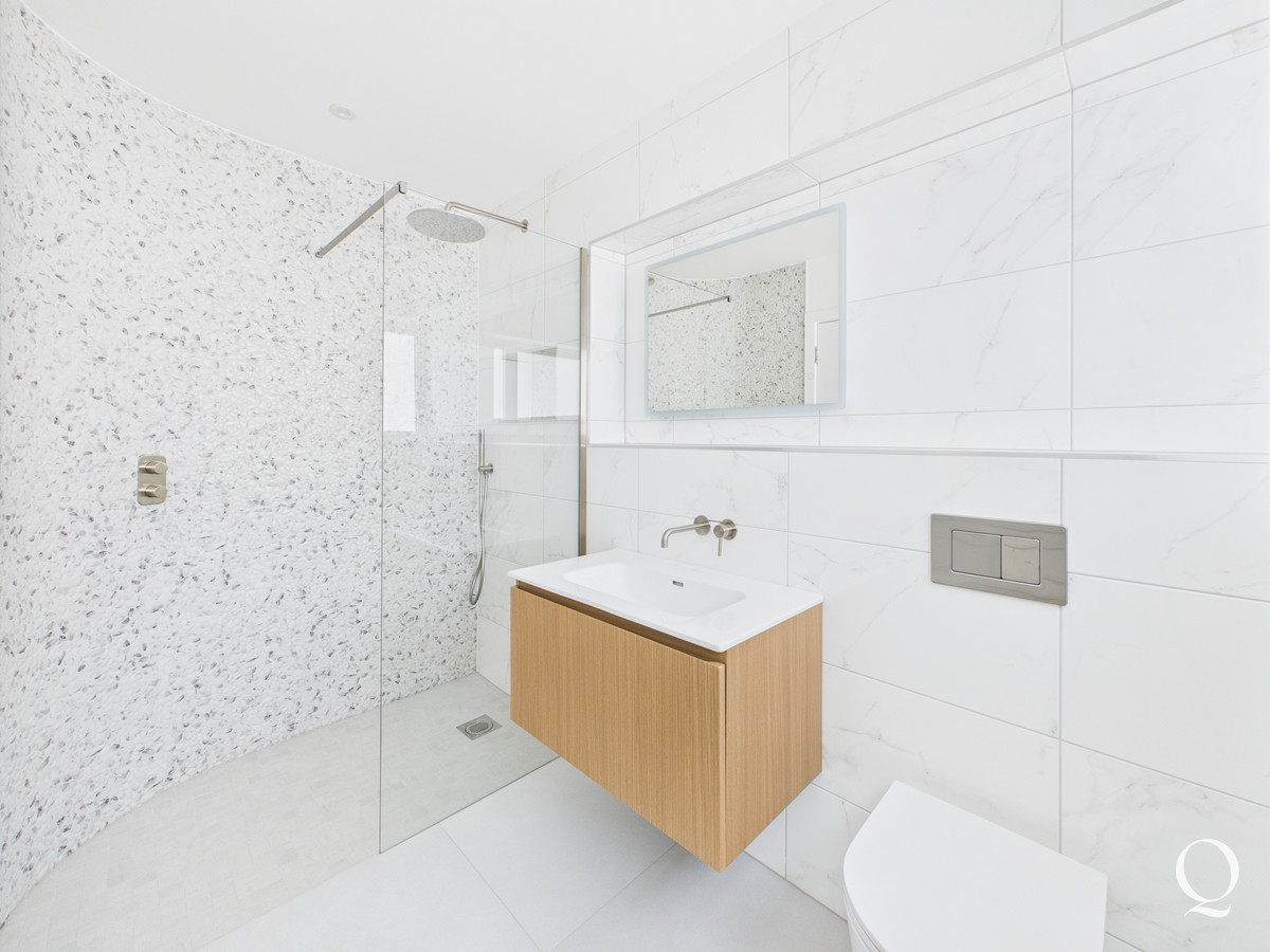 On the first floor the landing gives access to three bedrooms. The principle bedroom is a large double room with bi-fold doors out to a southerly balcony. A walk in wardrobe is fitted with a range of hanging and shelving space, with concealed LED lighting. The en-suite has been beautifully re-fitted with fully tiled floor and walls, twin basins, bath, WC and separate shower enclosure. Bedroom two boasts its own en-suite shower room whilst the third double bedroom is served by a separate bathroom.