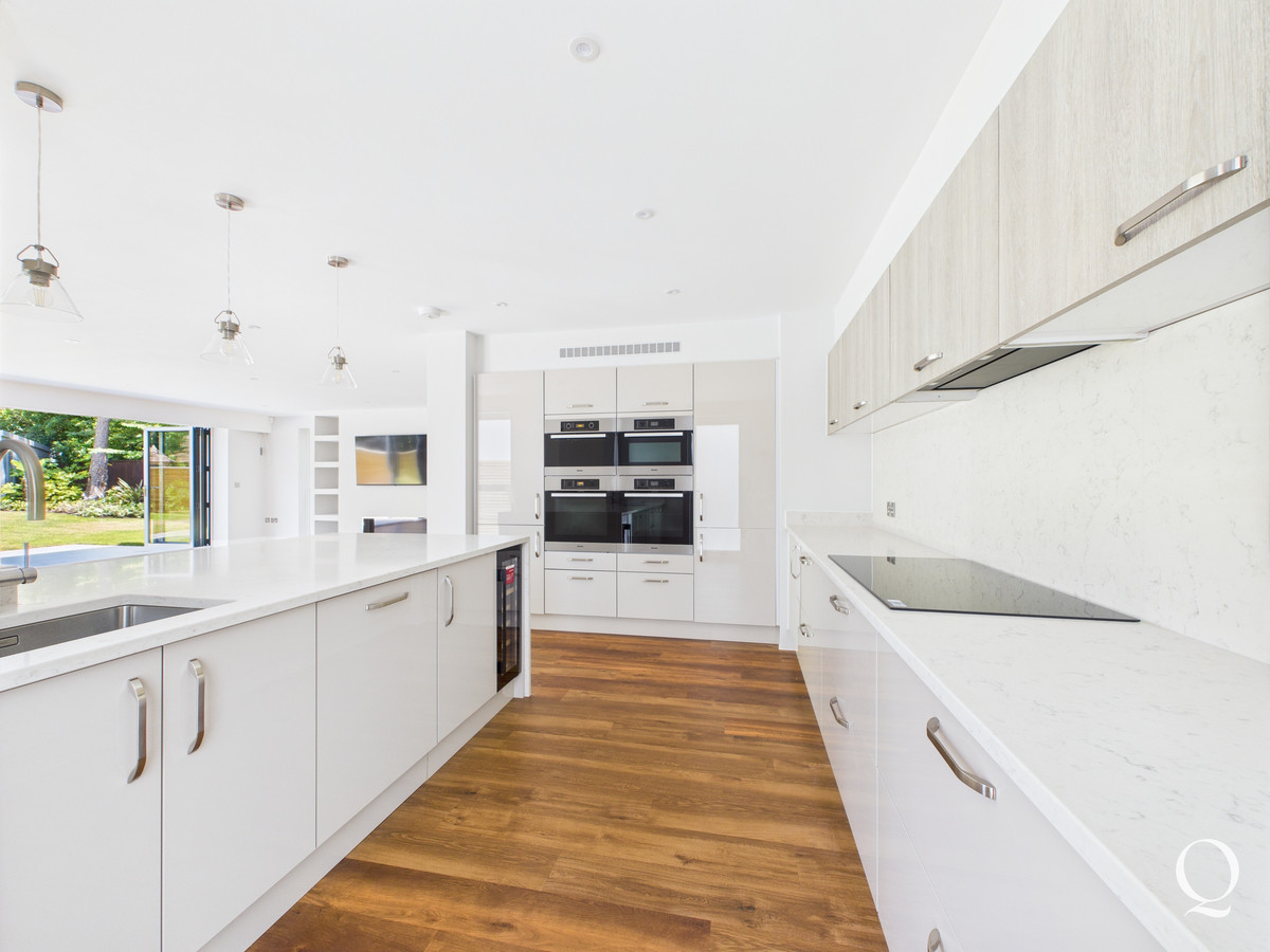 On the ground floor there is a large, open plan kitchen/dining/living space with bi-fold doors opening to the rear garden, feature media wall and Karndean flooring. The kitchen is fitted with a range of base and eye level units, polished granite worksurfaces and breakfast bar and a range of integrated appliances. The hallway also gives access to a ground floor cloakroom, useful storage cupboard and access to the double garage.